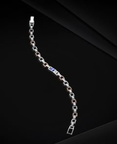 A sleek bracelet with dual-tone links and a regal blue enamel centrepiece, showcasing Dhoni’s signature — symbolizing enduring legacy.