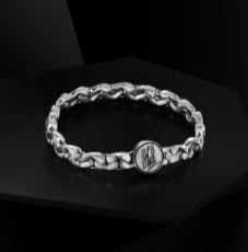 Interlocking platinum links form a bold bracelet that reflects resilience and inner strength. Its solid clasp bears Dhoni’s etched signature.